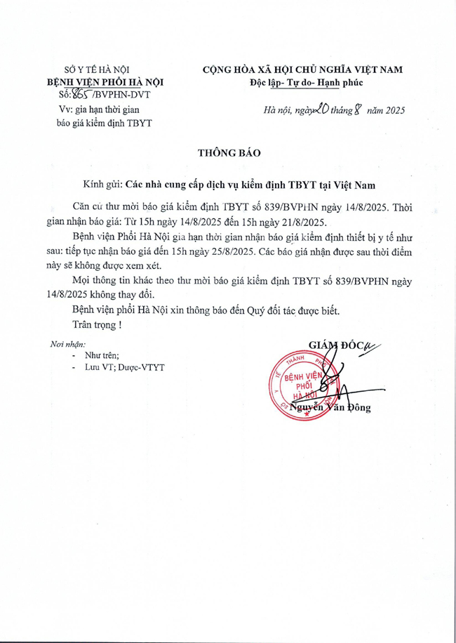 Bệnh viện Phổi Hà Nội gia hạn thời gian nhận báo giá dịch vụ tư vấn đầu tư mua sắm TBYT năm 2025 như sau: tiếp tục nhận báo giá đến 10h ngày 25/08/2025. Các báo giá nhận sau thời điểm này không được xem xét.