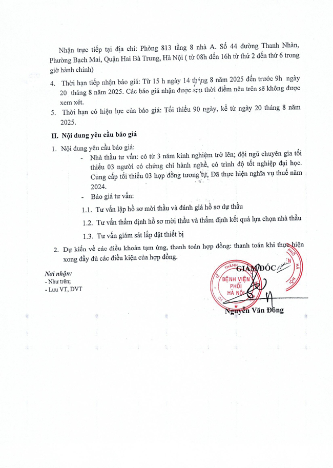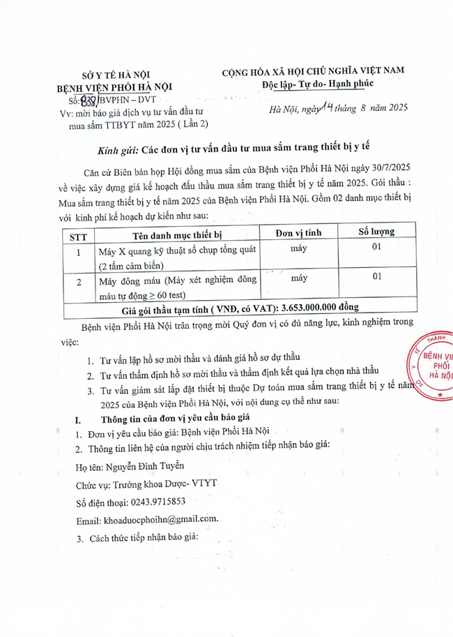 Căn cứ Biên bản họp Hội đồng mua sắm của Bệnh viện Phổi Hà Nội ngày 30/07/2025 về việc xây dựng giá kế hoạch đấu thầu mua sắm trang thiết bị y tế năm 2025. Gói thầu: Mua sắm trang thiết bị y tế năm 2025 của Bệnh viện Phổi Hà Nội. Gồm 02 danh mục thiết bị với kinh phí kế hoạch dự kiến như sau: