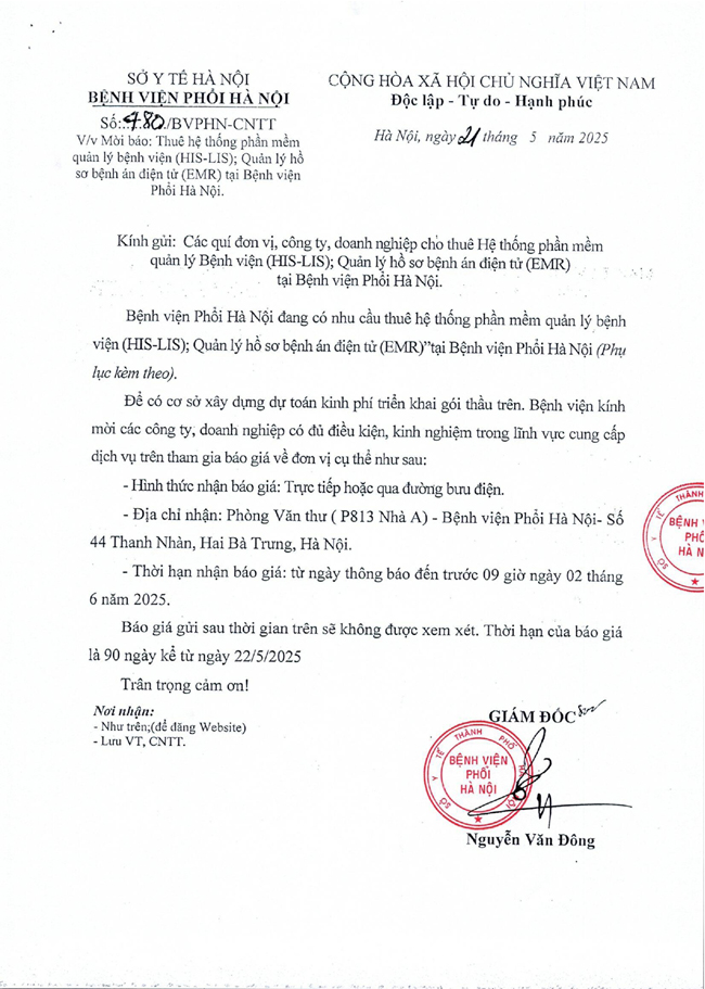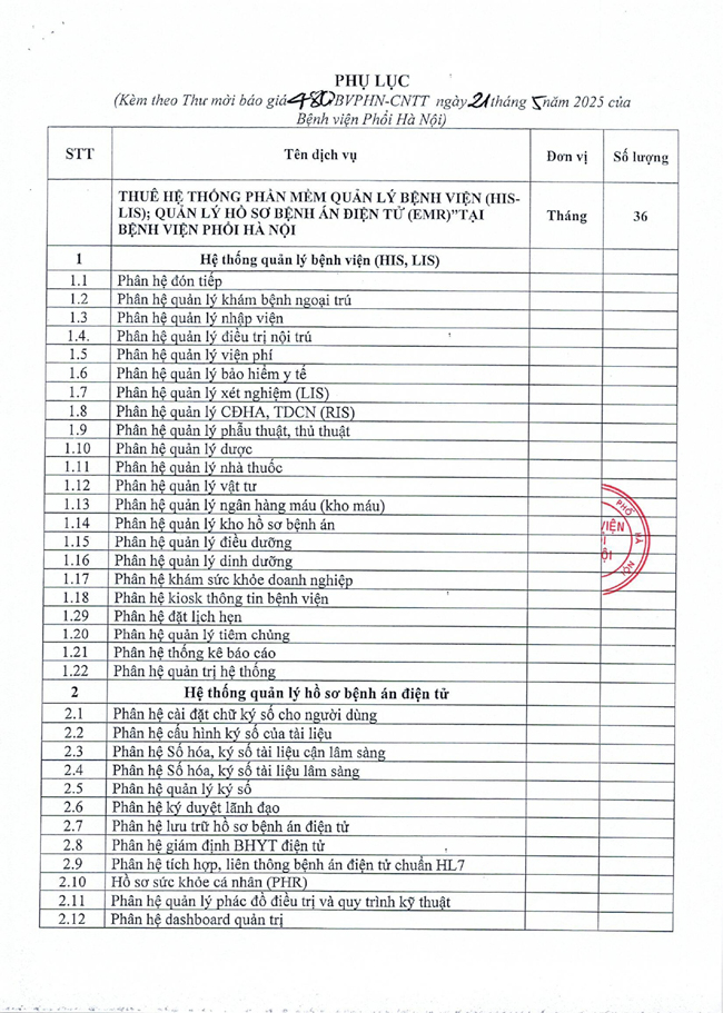 Kính gửi: các quí đơn vị, công ty, doanh nghiệp cho thuê Hệ thống phần mềm quản lý Bệnh viện (HIS-LIS); Quản lý hồ sơ bệnh án điện tử (EMR) tại Bệnh viện Phổi Hà Nội